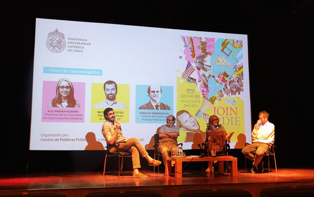 Después de la proyección de la película, el panel de discusión, integrado por Alejandra Pizarro, presidenta de la Comunidad de Organizaciones Solidarias; Matías Bargsted, director del Instituto de Sociología UC; e Ignacio Irarrázaval, director del Centro de Políticas Públicas UC, reflexionó sobre cómo el fortalecimiento de los lazos comunitarios puede ser una herramienta clave para abordar desafíos sociales como la desigualdad y la exclusión. Asimismo, analizaron cómo la atomización social, vinculada al retraimiento hacia la vida privada, afecta negativamente a la cohesión social. A su vez destacaron que mejorar la democracia chilena requiere revitalizar nuestras comunidades y promover el trabajo colectivo.